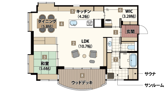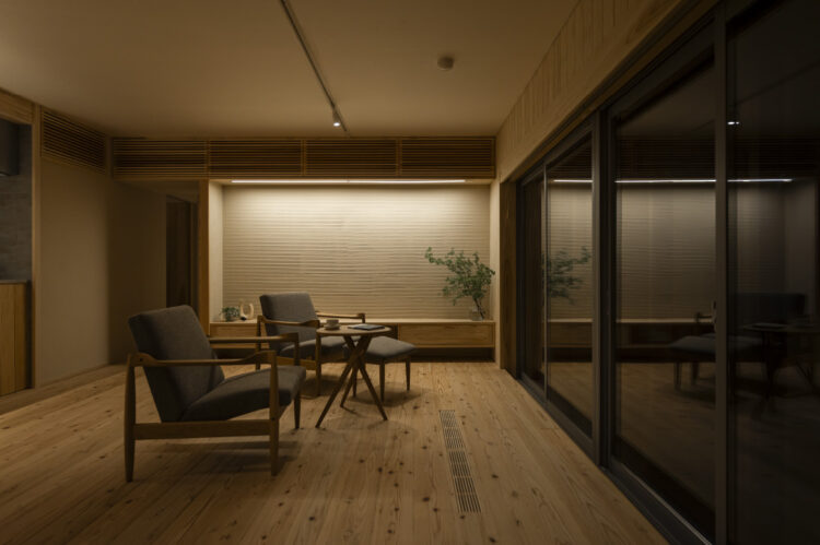 やわらかな光に包まれるLDKでゆったりとくつろぎ、夜はサウナとデッキで心身をリセット。