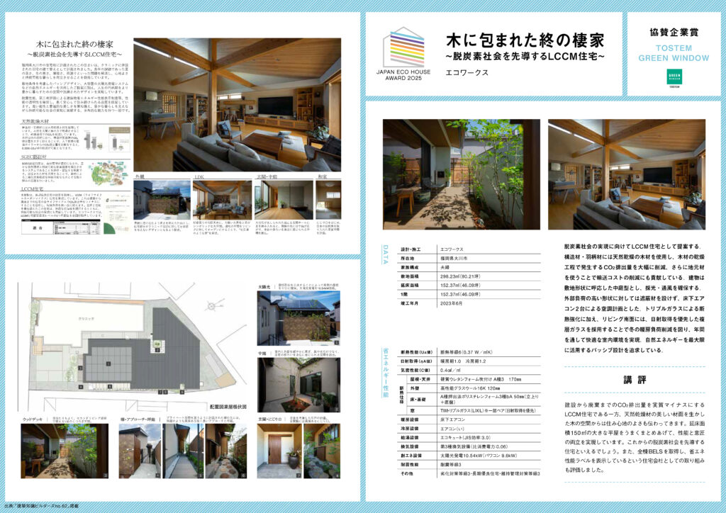 建設から廃棄までのCO2排出量を実質マイナスにするLCCM住宅である一方、天然乾燥材の美しい材面を生かした木の空間からは住み心地のよさも伝わってきます。延床面積150㎡の大きな平屋をうまくまとめあげて、性能と意匠の両立を実現しています。これからの脱炭素社会を先導する住宅といえるでしょう。また、全棟BELSを取得し、省エネ性能ラベルを表示しているという住宅会社としての取り組みも評価しました。